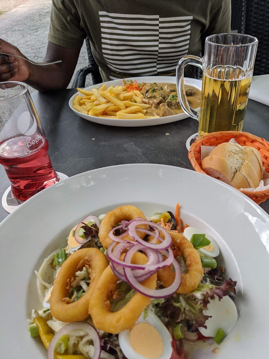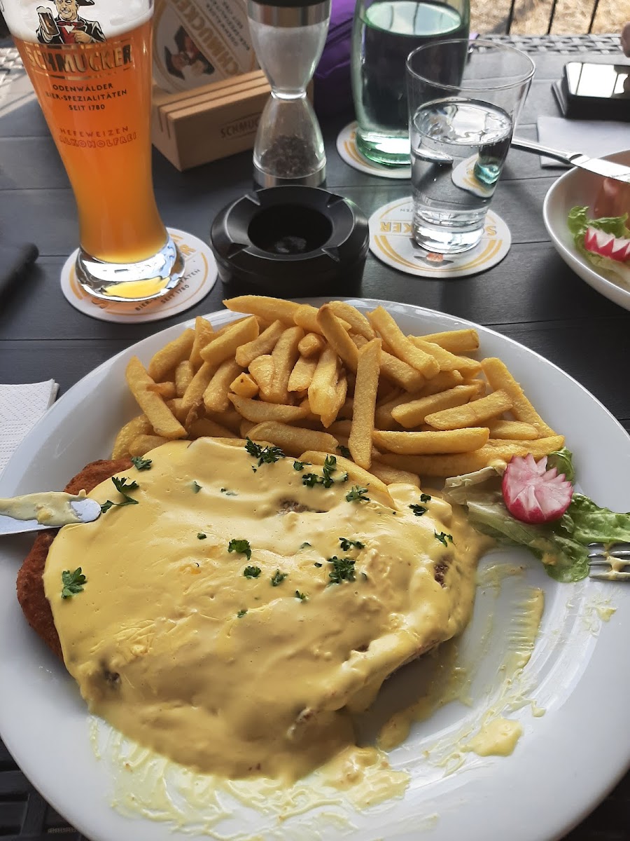 One of the standout dishes at Vereinslokal 'zur Gärtnerruh' is the Lok Schnitzel with Pommes and Hollandaise Sauce. This dish is a must-try for anyone craving classic German comfort food. The tender schnitzel is perfectly paired with crispy fries and the rich, velvety hollandaise sauce that adds a delightful creaminess to each bite. For those who love fresh salads, the restaurant’s Salad with Octopus offers a light and flavorful alternative, with perfectly grilled octopus atop a bed of crisp greens.